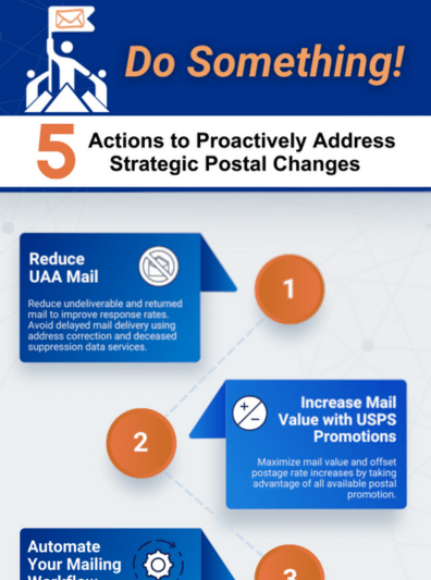 The USPS® is implementing bold changes as part of their Delivering For America (DFA) plan to transform for future growth and sustainability. We have created an easy-to-follow strategic plan that you and your mailing organization can use to Do Something! to proactively address these postal changes. Download our eBook today and learn the: